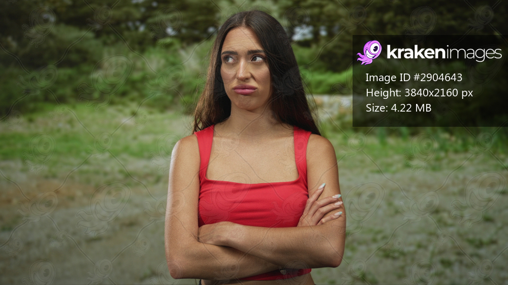 Young hispanic woman with arms crossed in park wearing red tank top and visible shoulders standing outdoors near green trees looking skeptical; annoyance. - Kraken Images