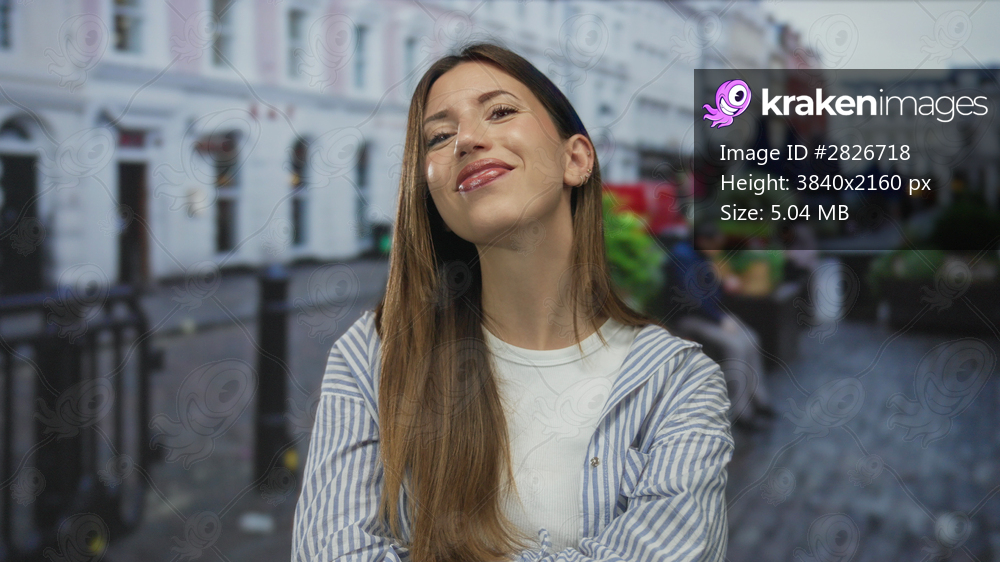Young hispanic woman with arms crossed on street near city buildings smiling directly at camera; friendly confidence.