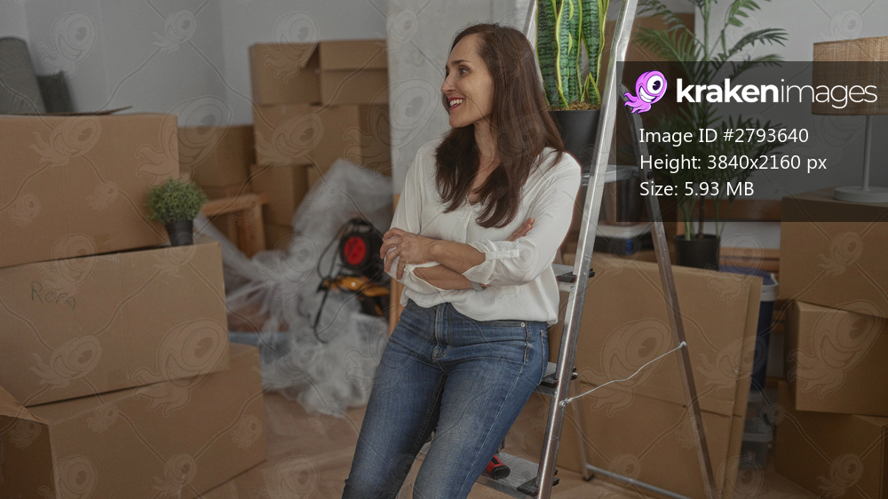 Young hispanic woman with arms crossed sitting on ladder in new home room; denial rejection.