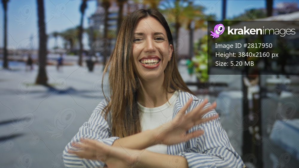 Young hispanic woman with arms crossed x on street restaurant terrace by palm trees under clear sky; rejection.