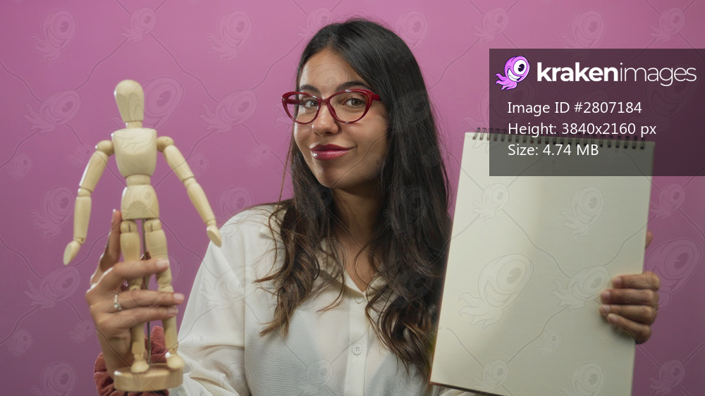 Young hispanic woman artist holding a notebook and a wooden mannequin against a pink wall background, expressing creativity and contemplation.