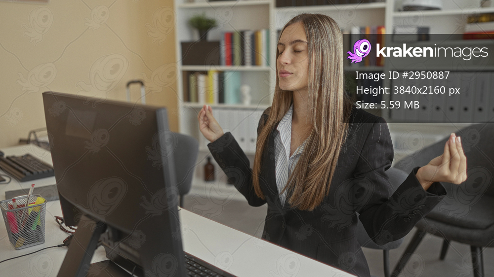 Young hispanic woman at a computer with hands in meditation gesture in office; mindfulness calm focus.