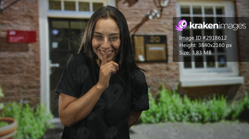 Young hispanic woman at house entrance smiling and holds finger to lips for silence in front of building; silence secrecy.