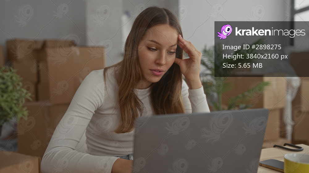 Young hispanic woman at laptop with hand on temple, resting elbow on table, surrounded by cardboard boxes in building; stressed moving transition.