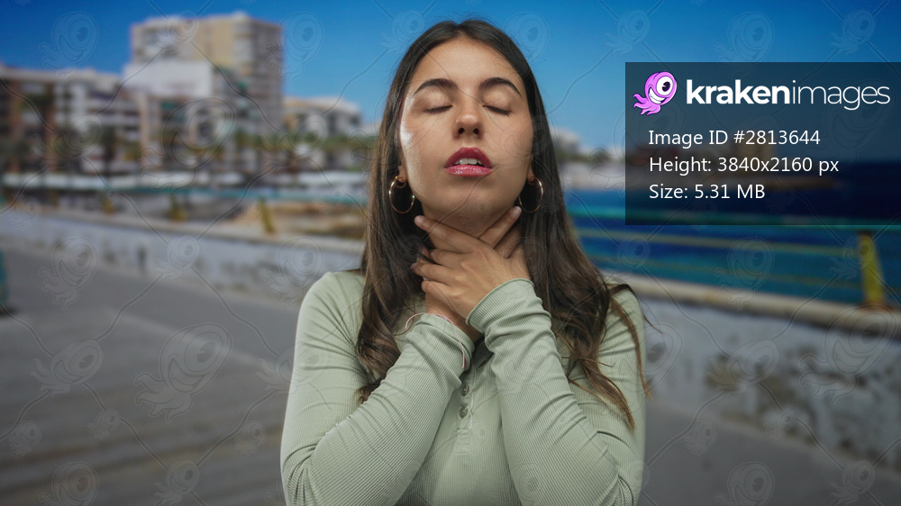 Young hispanic woman at seaside promenade holding throat in distress, surrounded by ocean and urban backdrop, underscoring tension in an outdoor setting. - Kraken Images