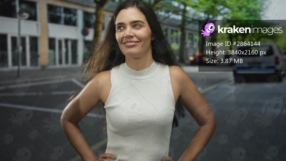Young hispanic woman bare arms hands on hips smiling sunlit city street; confidence empowerment growth.