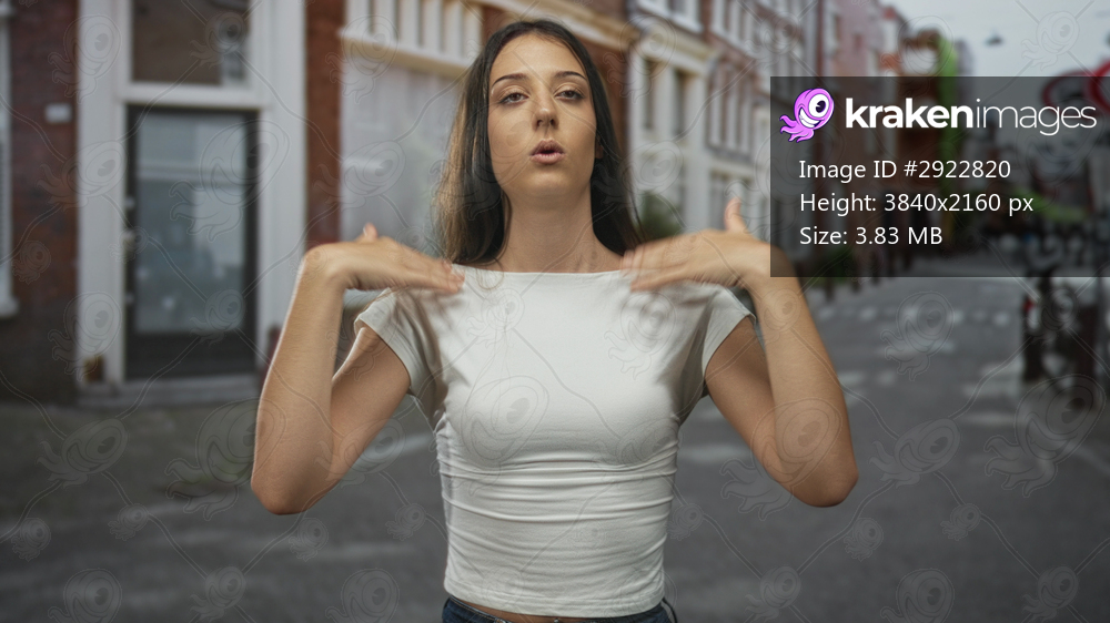 Young hispanic woman with bare arms, hands to shoulders on a cobbled city street, eyes closed and lips pursed while breathing deeply; serenity.