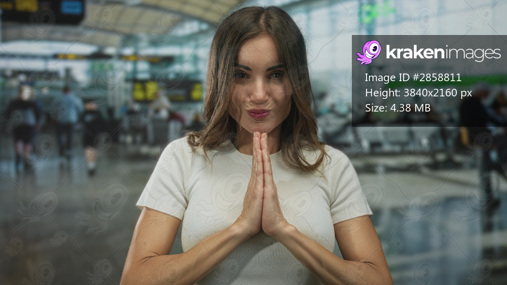 Young hispanic woman with bare hands pressed in prayer gesture inside bustling airport terminal; hope.