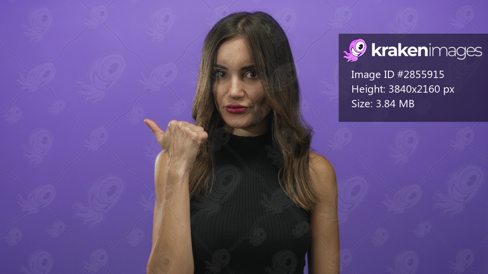 Young hispanic woman with bare shoulder and direct gaze points thumb sideways in purple studio; skepticism.