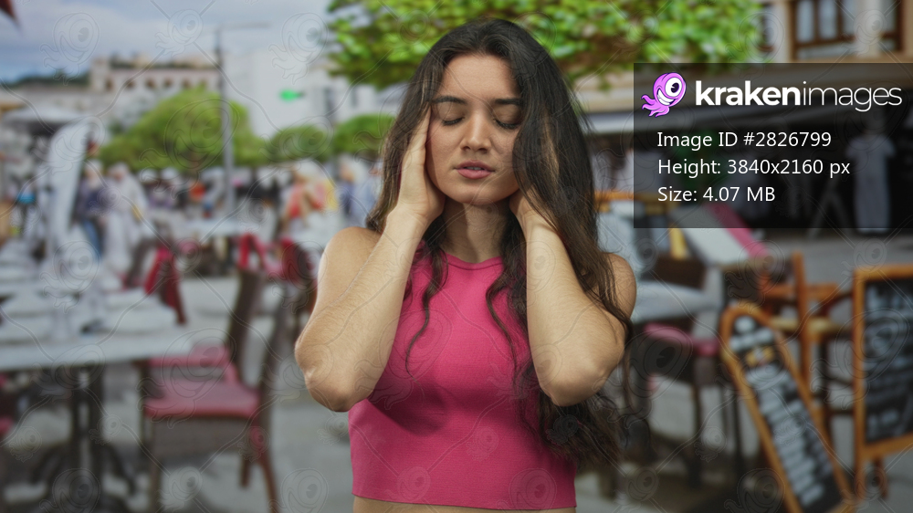 Young hispanic woman with bare shoulders wearing a pink tank top tucks hair behind ears on sunny restaurant terrace surrounded by outdoor dining tables; stress. - Kraken Images