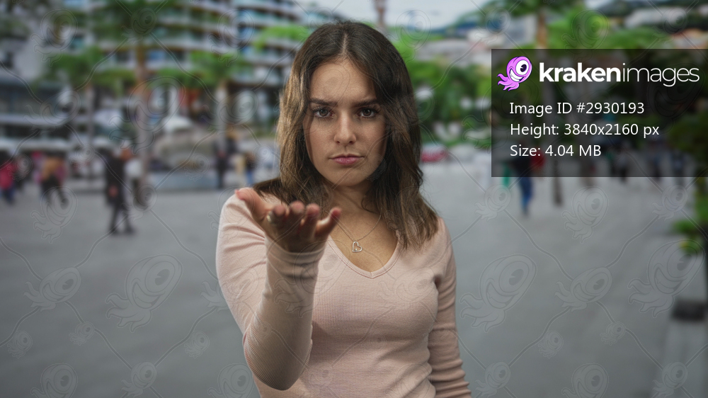 Young hispanic woman beckoning with fingers and stern gaze on a busy city street plaza, palm forward, heart necklace visible; determination.