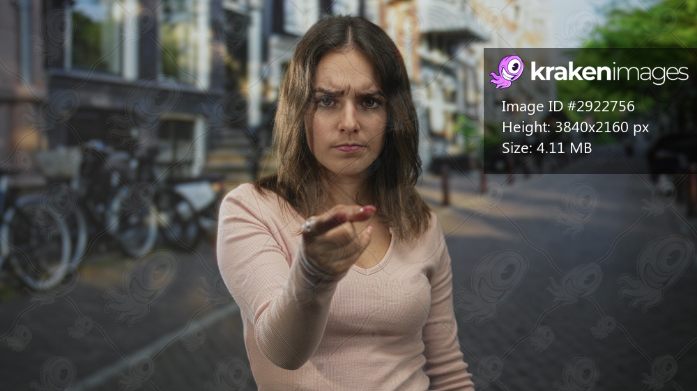 Young hispanic woman beckons with hand on city street, palm extended and frowning, wearing pink shirt and necklace; demand frustration anger.