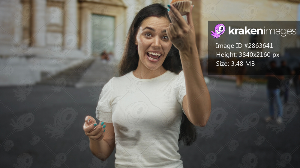 Young hispanic woman beckons with hand while holding muffin on street near historic building, smiling to camera; joy friendly invite.