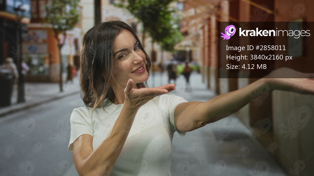 Young hispanic woman beckons with hands palm up on a city street, wearing a white tshirt, smiling toward camera; playful invitation.