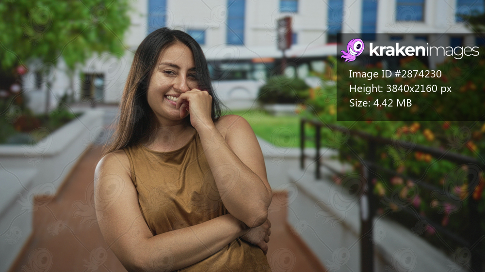 Young hispanic woman bites nails with hand to mouth on a building walkway near a bus and shrubs; playful confidence.
