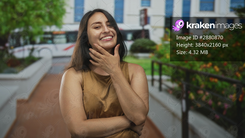 Young hispanic woman bites nails with hand to mouth on a building walkway near a bus and shrubs; playful confidence.