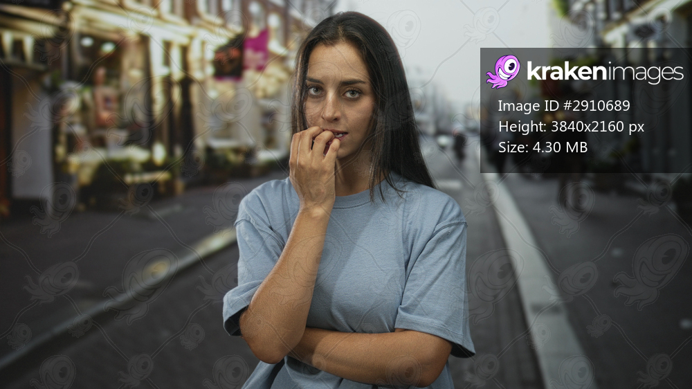 Young hispanic woman biting fingernails on a city street, hand to mouth and arms crossed; anxiety uncertainty.