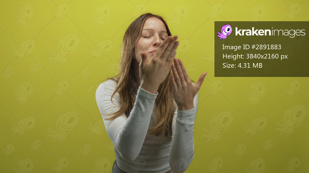 Young hispanic woman blowing a kiss with both hands visible in lime green studio setting, wearing white top; affection.