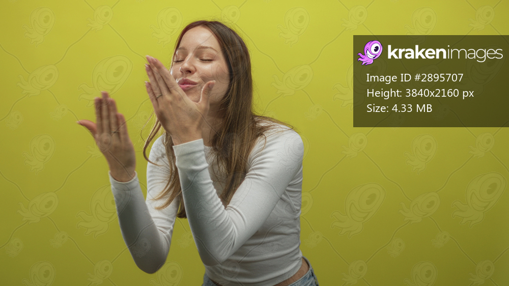 Young hispanic woman blowing a kiss with both hands visible in lime green studio setting, wearing white top; affection.
