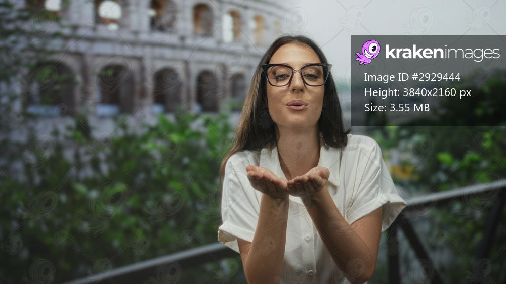 Young hispanic woman blowing a kiss with cupped hands on a balcony by the coliseum building; romantic travel memory.