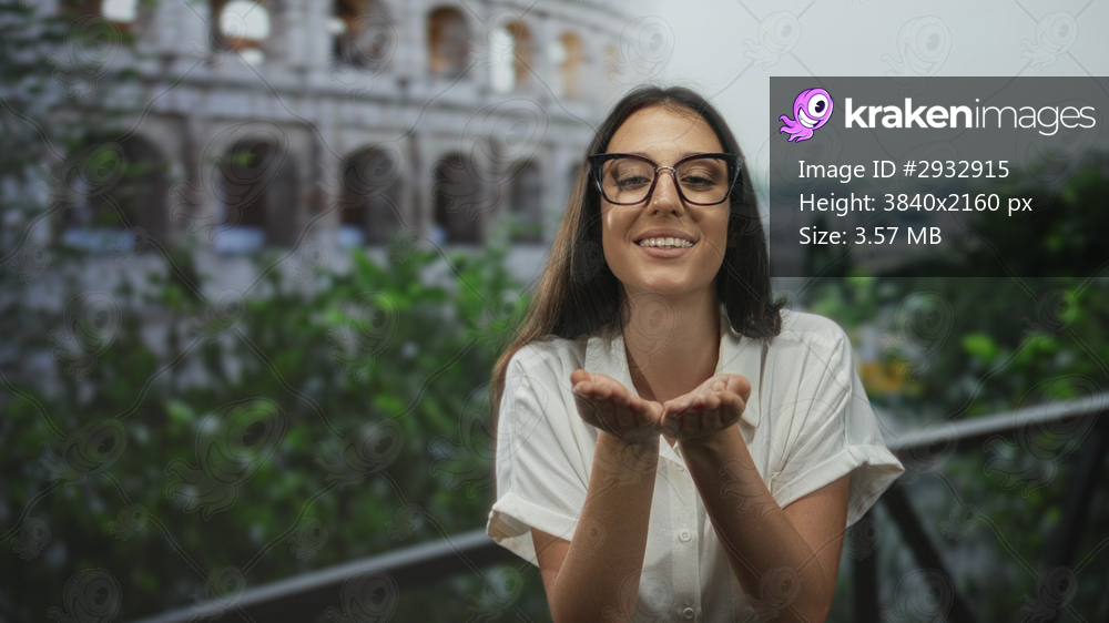 Young hispanic woman blowing a kiss with cupped hands on a balcony by the coliseum building; romantic travel memory.