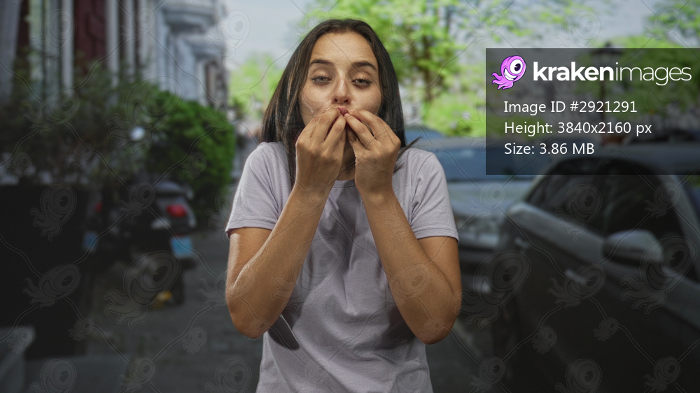 Young hispanic woman blowing a kiss with hand to lips on a city street while facing camera; affection greeting.
