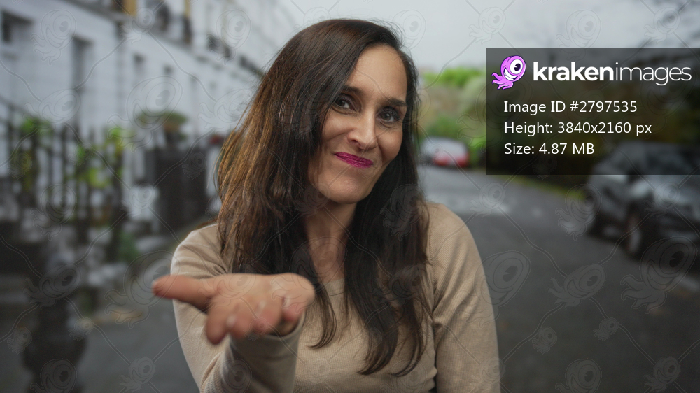Young hispanic woman blowing kiss with hand on downtown street; affectionate greeting warmth intimacy.