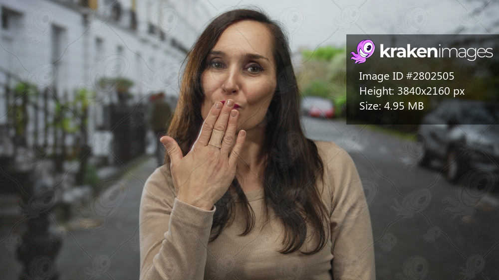 Young hispanic woman blowing kiss with hand on downtown street; affectionate greeting warmth intimacy.