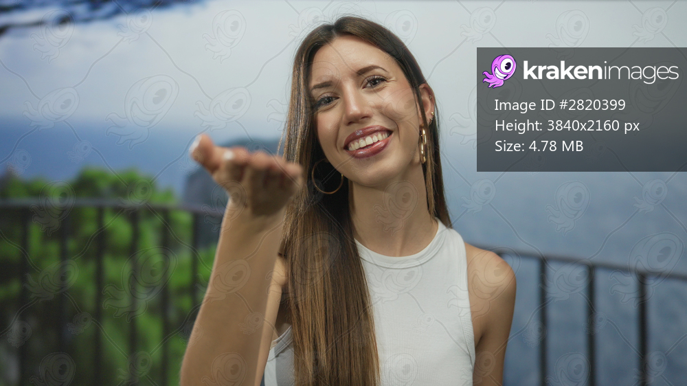 Young hispanic woman blowing kiss with outstretched hand on sunny seaside promenade at golden hour; warmth.