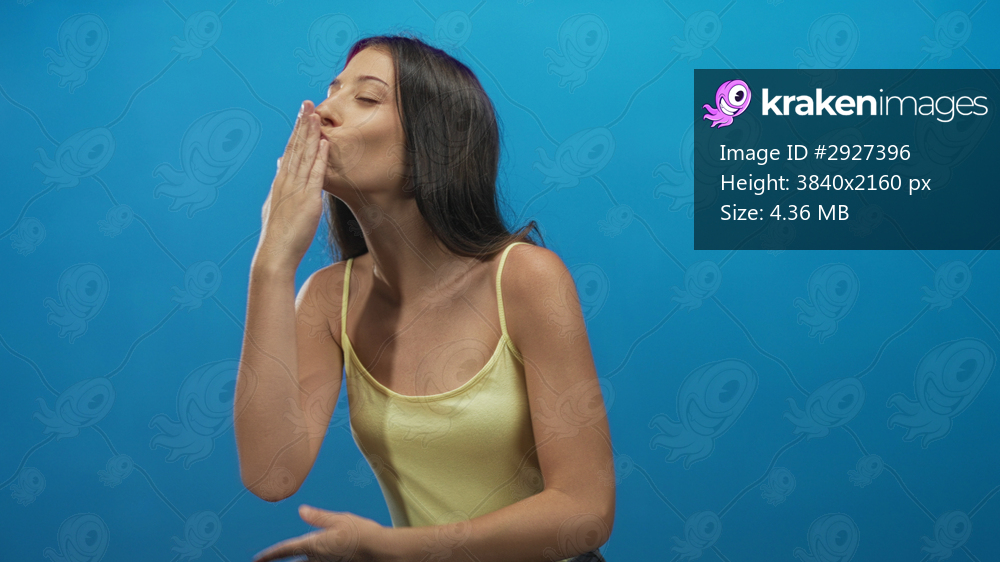Young hispanic woman blows a kiss with lips and hands in a studio against a bright blue set; playful affection.