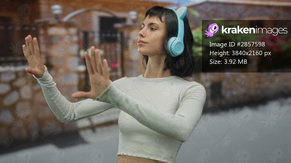 Young hispanic woman with blue cat ear headphones points finger at brick fence on a street; urban curiosity.