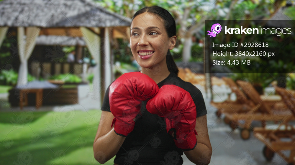 Young hispanic woman boxer wearing red boxing gloves, fists raised in front of a building poolside gazebo, smiling with eyes closed; joy fitness.