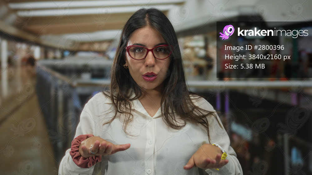 Young hispanic woman breathing with open mouth and open palms in a bright shopping mall building; serenity.