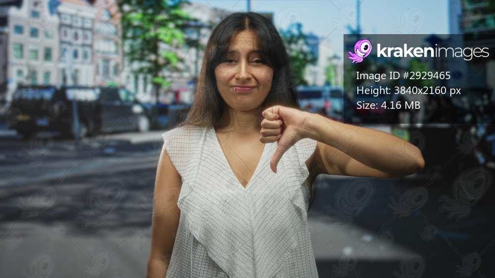 Young hispanic woman, brunette, giving thumbs down gesture with closed eyes on a busy city street wearing white blouse; disapproval social commentary.