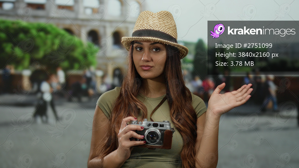 Young hispanic woman with camera waving at roman coliseum, showcasing travel and exploration in rome, italy, highlighting her role as a tourist capturing memories outdoors. - Kraken Images