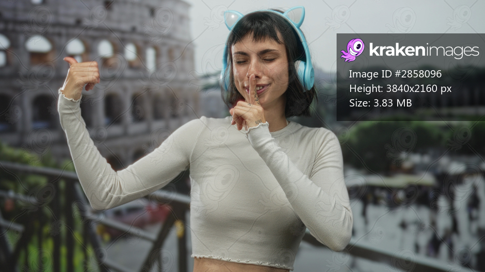 Young hispanic woman with cat ear headphones and finger to lips for silence at coliseum building; hush.