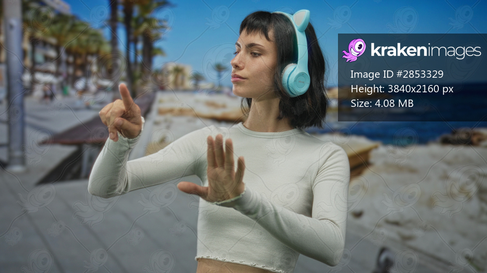 Young hispanic woman with cat ear headphones points finger to object on street at a seaside promenade; curiosity.