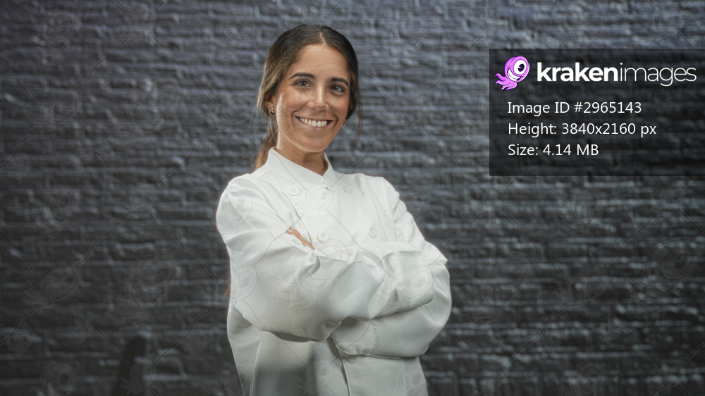 Young hispanic woman chef with arms crossed and a warm smile in studio against textured brick wall; confidence expertise.