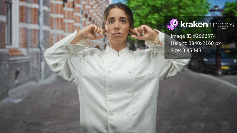 Young hispanic woman chef covers ears with fingers on street in white chef coat and neutral expression; frustration resilience determination.