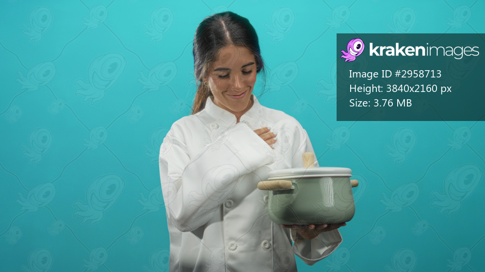 Young hispanic woman chef holding a green pot with wooden handles, hand on chest gesture in studio with teal backdrop; quiet pride.