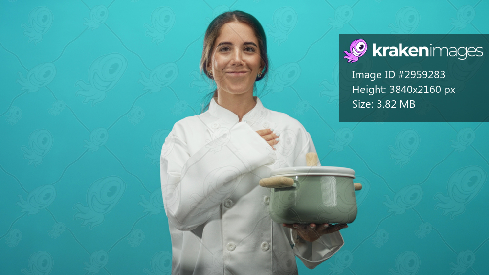 Young hispanic woman chef holding a green pot with wooden handles, hand on chest gesture in studio with teal backdrop; quiet pride.