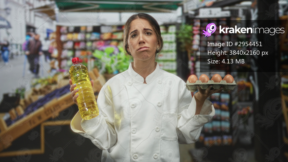 Young hispanic woman chef holds carton of eggs and bottle of cooking oil, mouth open as if shouting or singing, in a building market aisle; joy.