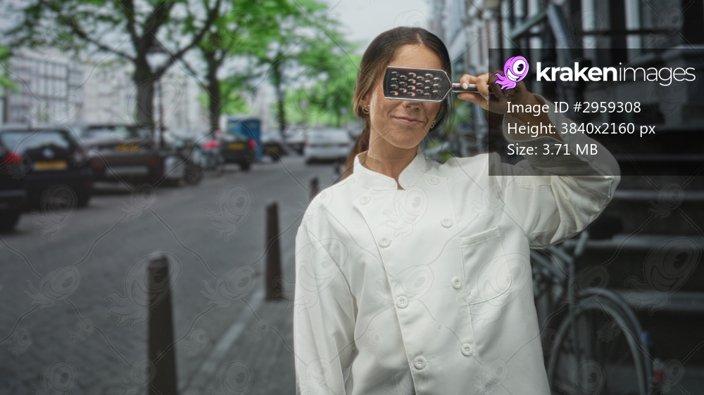Young hispanic woman chef holds metal grater over one eye while smiling on a city street by bicycle and stone steps; playful smile.
