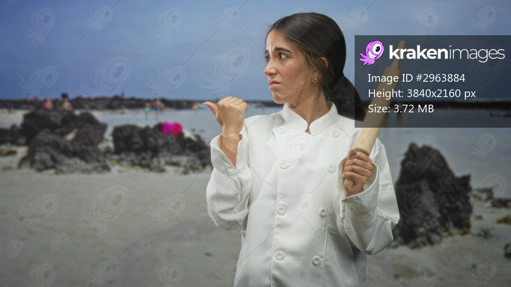 Young hispanic woman chef in white coat holds a wooden rolling pin and points thumb over shoulder toward distant rocks on a sandy beach shore; frustration. - Kraken Images