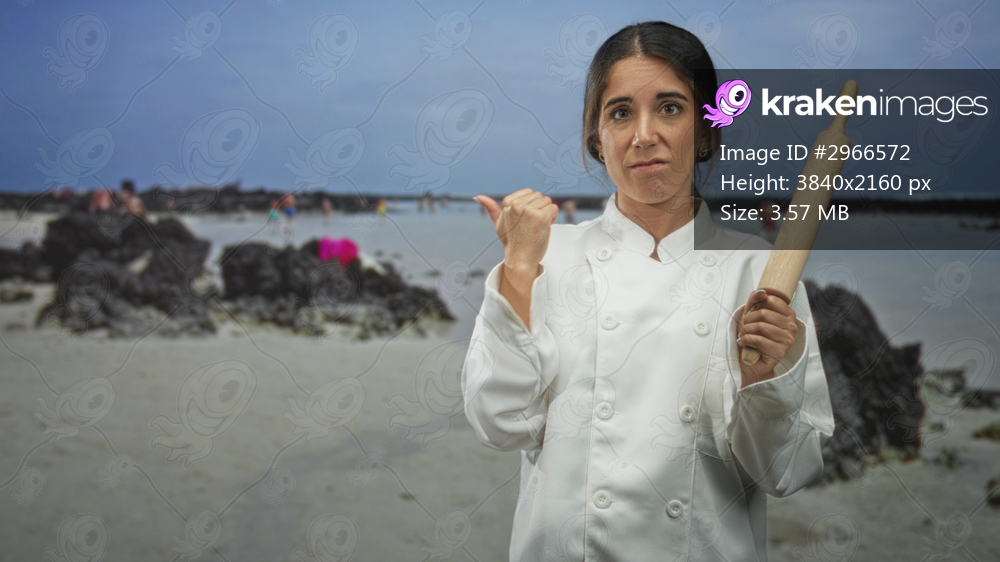 Young hispanic woman chef in white coat holds a wooden rolling pin and points thumb over shoulder toward distant rocks on a sandy beach shore; frustration. - Kraken Images