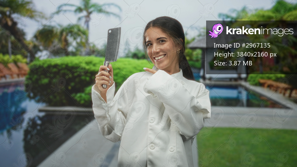 Young hispanic woman chef smiling and holding cleaver up in right hand beside a tropical pool gazebo building; confidence skill hospitality.