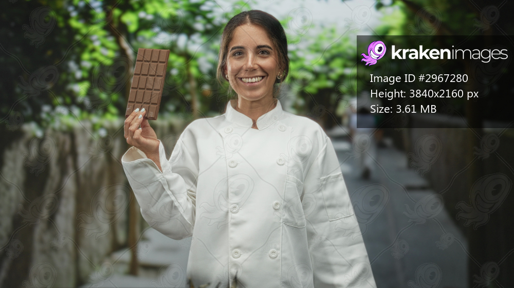 Young hispanic woman chef smiling holds chocolate bar in right hand while wearing white chef coat on a tree lined street; joy pride.