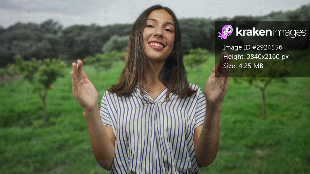 Young hispanic woman clapping hands in a green field park with trees and grass, smiling in a striped shirt; joy celebration.