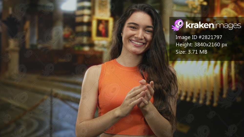Young hispanic woman clapping hands in church aisle near candlestick wearing sleeveless top; spiritual joy.