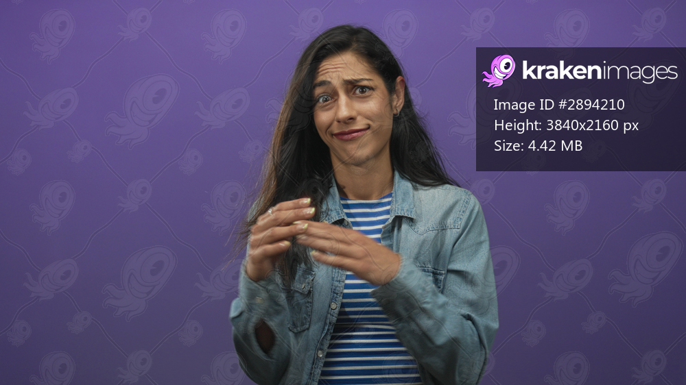 Young hispanic woman clapping hands with raised eyebrows in purple studio wearing denim jacket and blue striped top; skepticism.